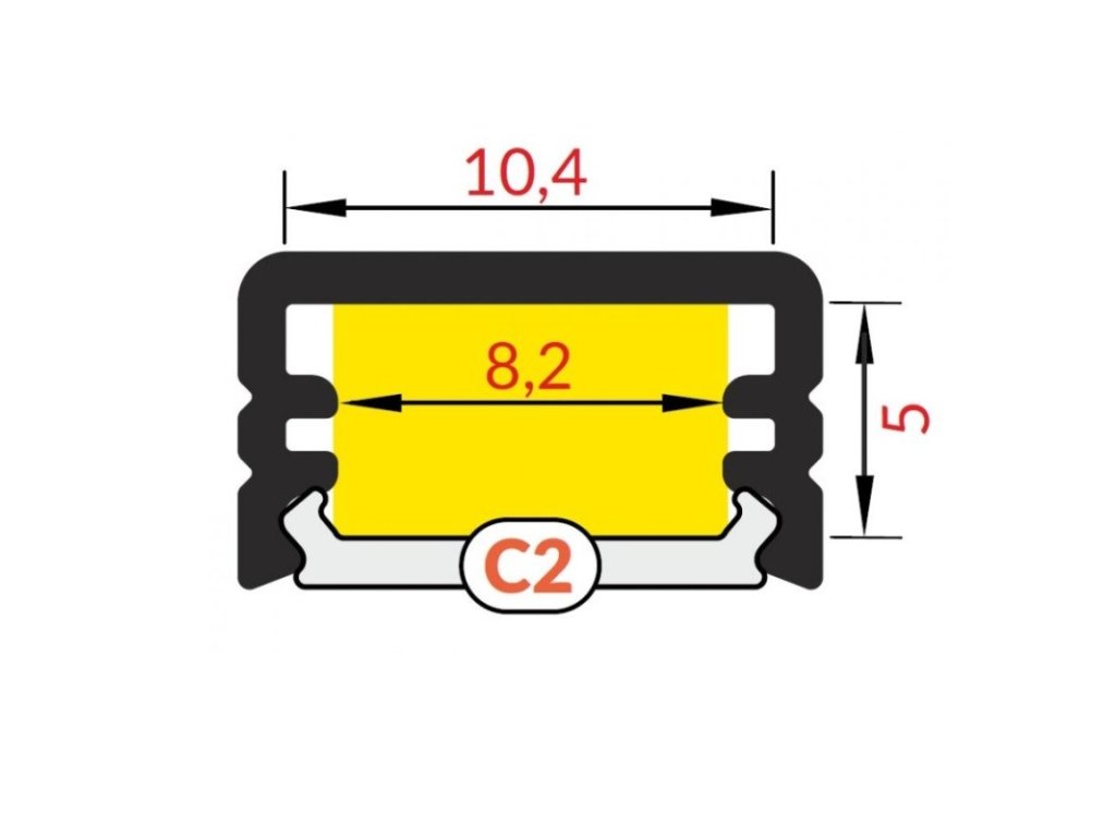 - Vnútorná šírka profilu v mieste pre nalepenie LED pásu 10,4mm, profil je primárne určený pre 8mm široké LED pásy