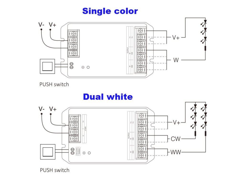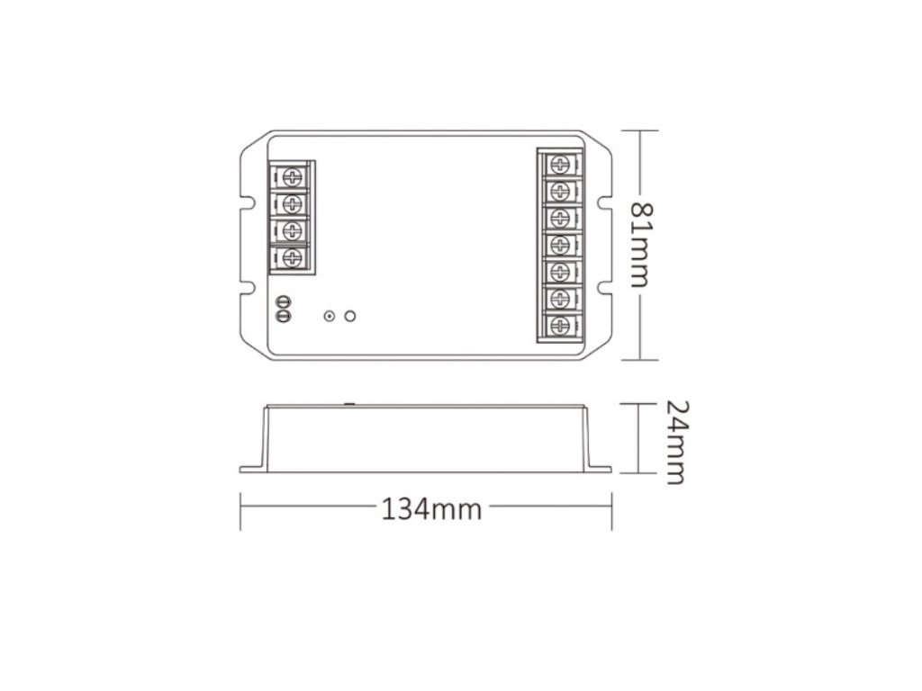 - Je to typ kontroléra 2 v 1, je určený pre použitie s jednofarebnými LED pásmi alebo s Dual White (CCT-umožňujúce nastavovanie teploty bielej farby svetla) LED pásmi