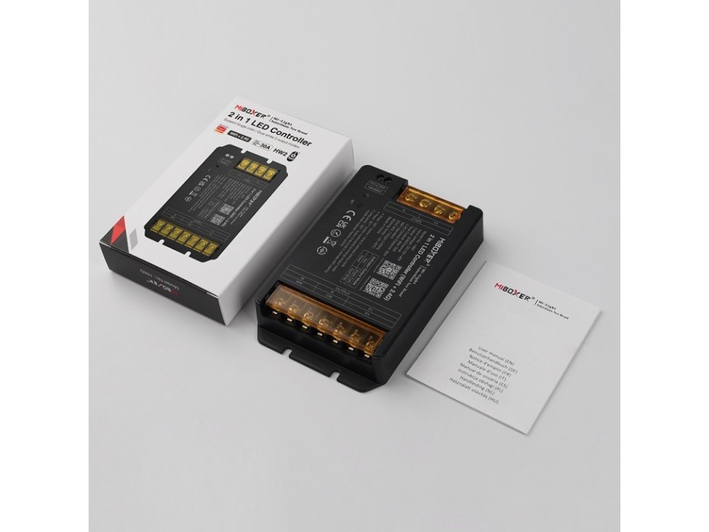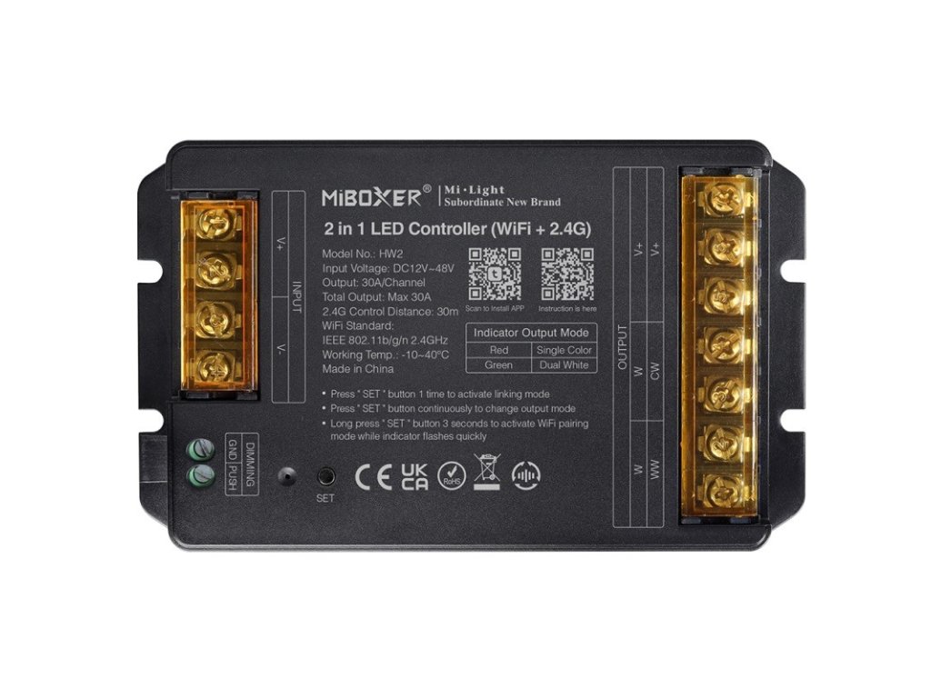 - Kontrolér-ovládač MiLight (MiBoxer) HW2 je výkonné zariadenie pre ovládanie jasu respektíve teploty bielej farby svetla určený pre ovládanie LED pásov (má zaťažiteľnosť až 30A)