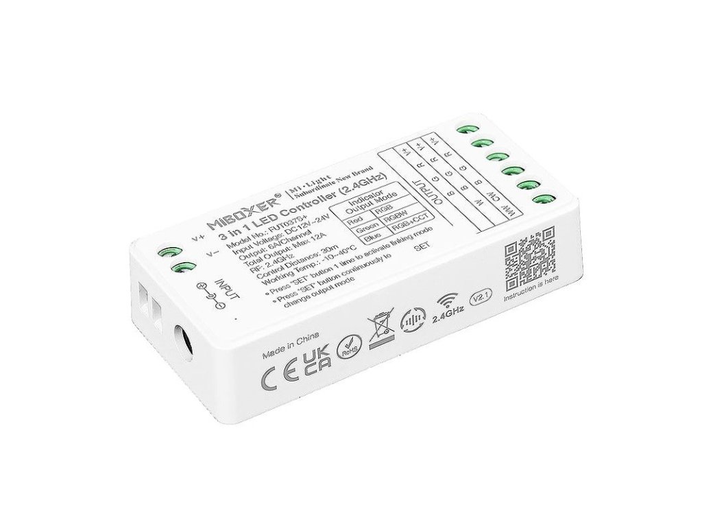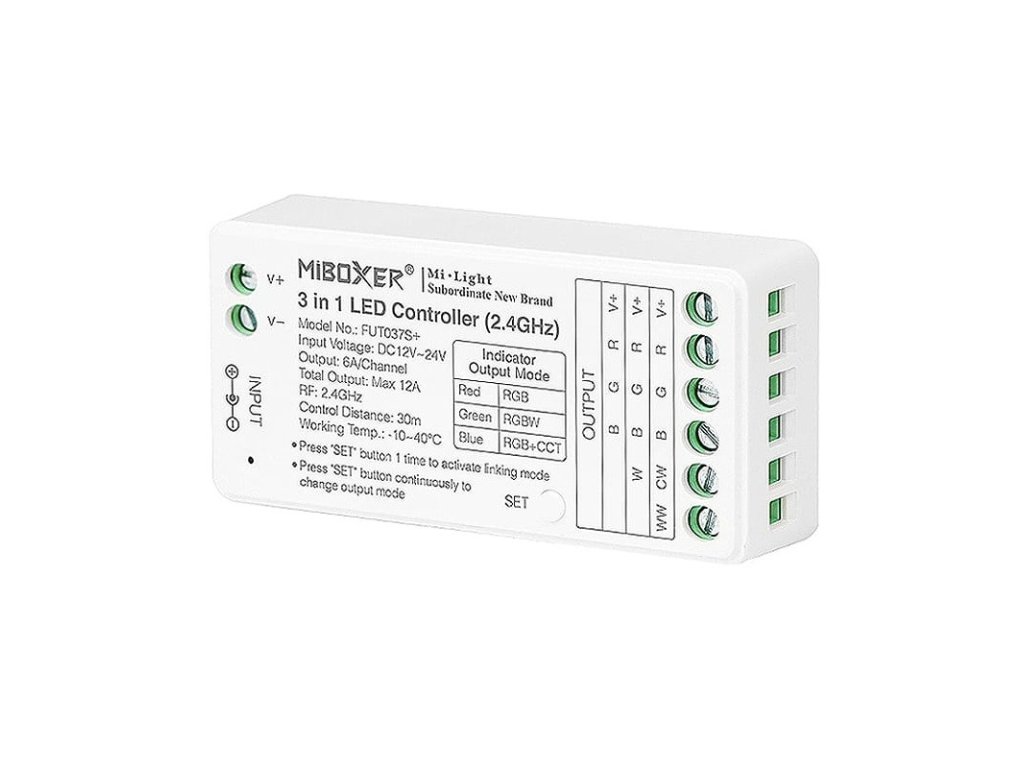 - Ovládač-receptor FUT037S+ je ovládanie 3in1, čiže podporuje RGB, RGBW a RGB+CCT LED aplikácie s pracovným napätím DC 12V až DC 24V