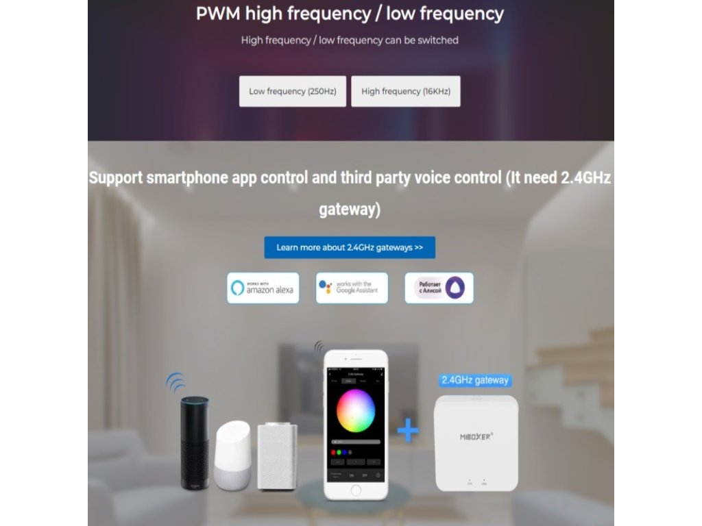 - Pri doplnení ovládania o WiFi prevodník - bránu MiLight je možné používať aj podporu ovládania pomocou hlasových asistentov ako Google Assitant, Amazon Alexa alebo Rabotaet s Alisoj a samozrejme ovládať osvetlenie cez smartfón alebo tablet