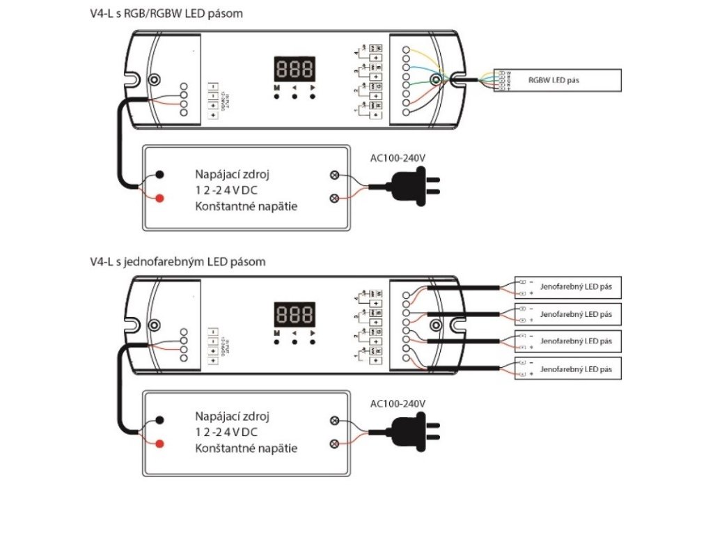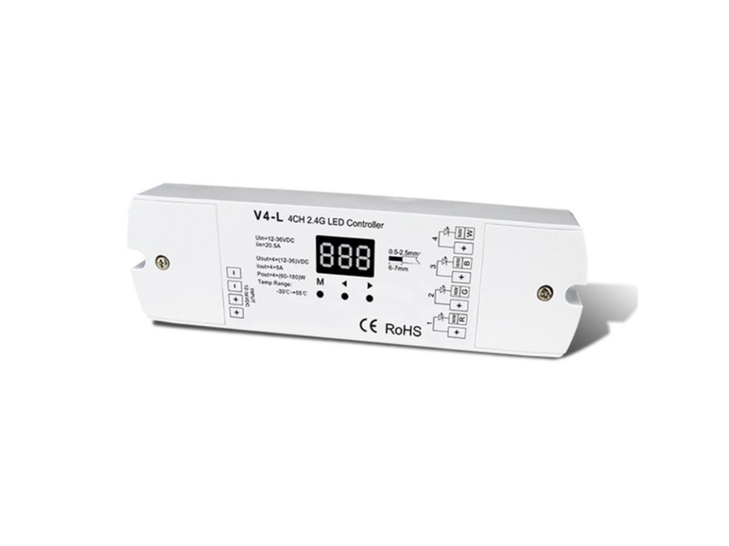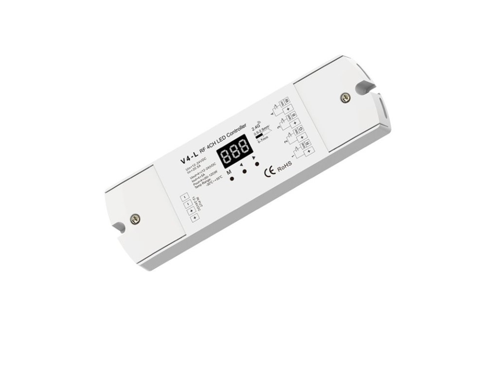 - SKD-V4-L je univerzálny 4-kanálový RF 2,4GHz receptor riadenia napäťových LED pásov s PWM výstupom o výkone 5A na kanál, primárne určený pre riadenie RGBW, môže byť ale použitý aj ako RGB kontrolér, CCT (LED pásy s teplou a studenou zložkou bielej farny svetla) kontrolér alebo DIMM (stmievač jednofarebných LED pásov) kontrolér