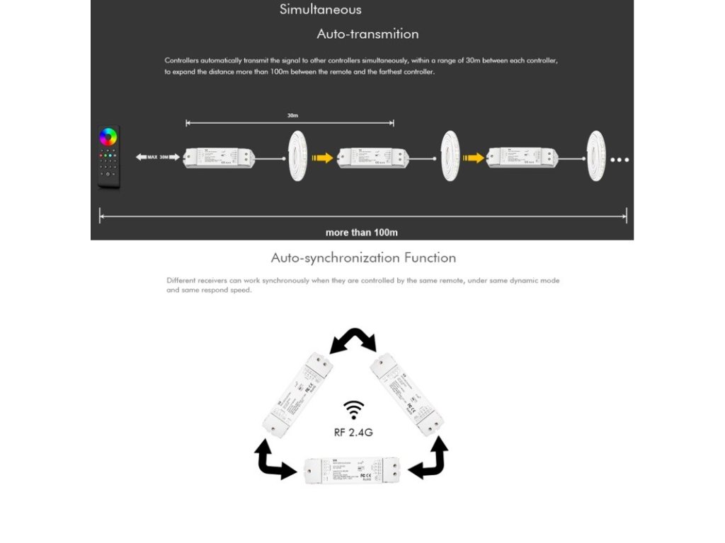 - Kontrolér má funckiu autosynchronizácie (prijatý signál zároveň posiela ďalším kontrolérom vo svojom dosahu)