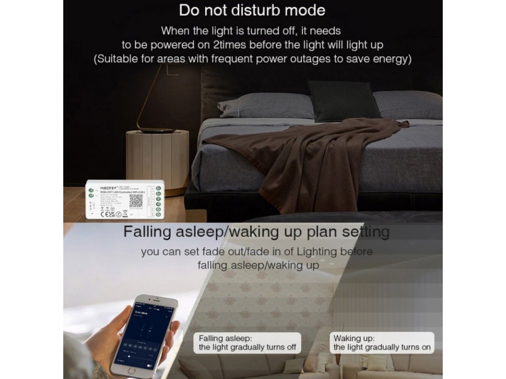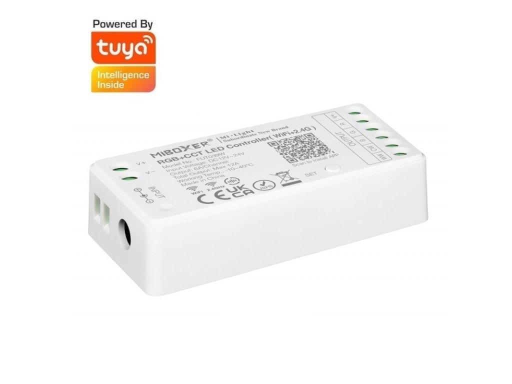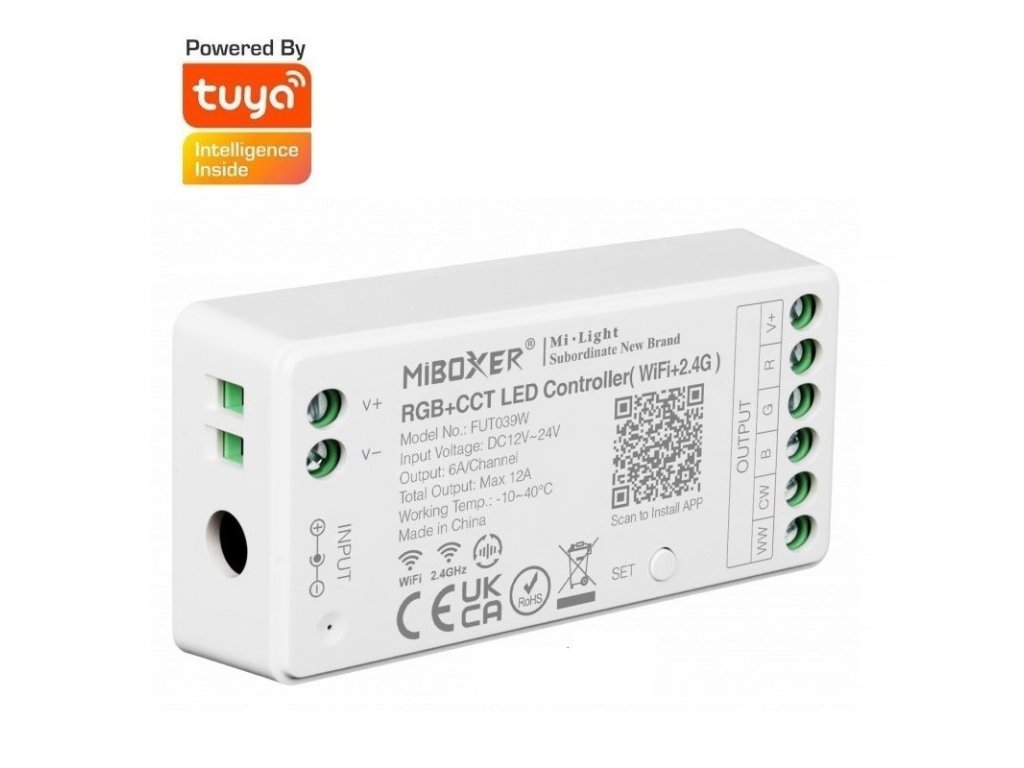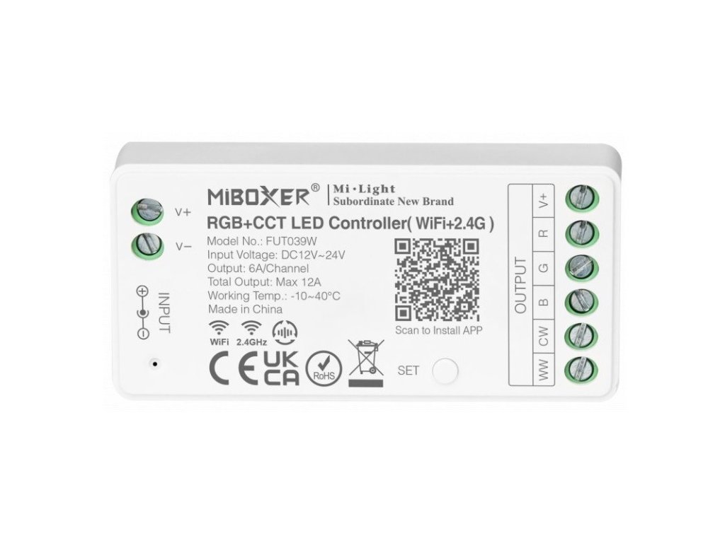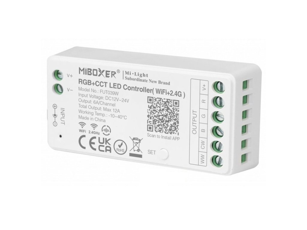 - Ovládač-receptor FUT039W umožňuje zapínať/vypínať, stmievať a meniť farbu emitovaného svetla v rozsahu RGBCCT (dokáže okrem zmeny farby svetla ovládať aj teplotu bielej farby svetla), je určený pre ovládanie napäťových LED pásov s napájacím napätím DC12/24V