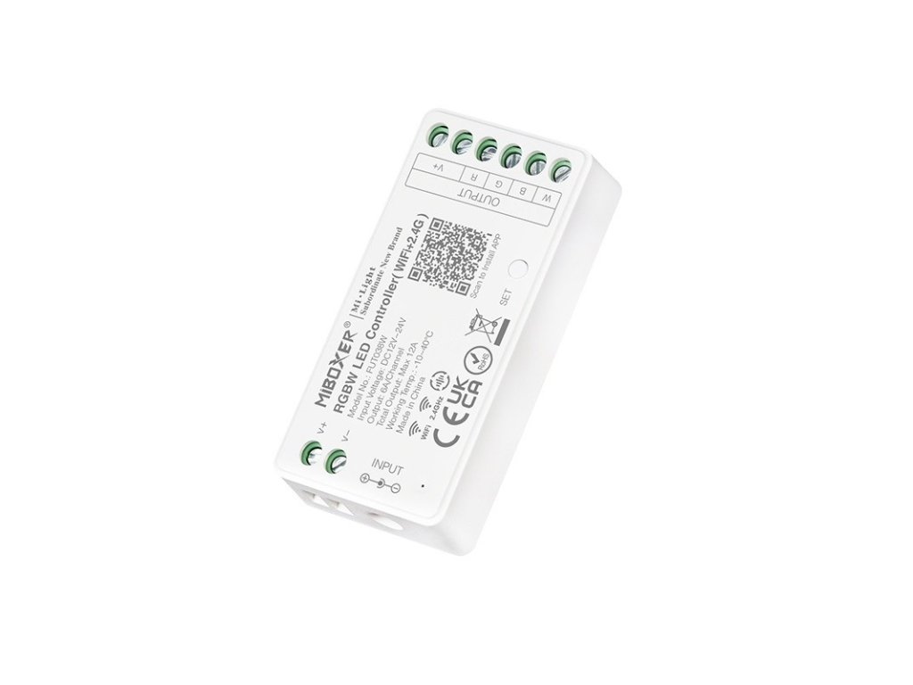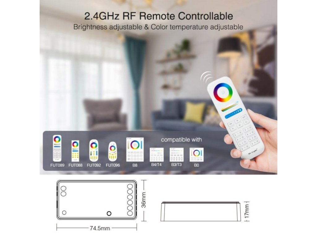 - Prijímač je primárne určený pre diaľkový ovládač MiLight FUT088 alebo MiLight FUT092, ktorým je možné ovládať až 4 nezávislé okruhy. Vyznačuje sa malými rozmermi, pracovnou frekvenciou 2,4GHz (dosah až do 30m) a jednoduchou inštaláciou pomocou svoriek na vstupe aj výstupe a DC konektorom pre napájanie z adaptéra.