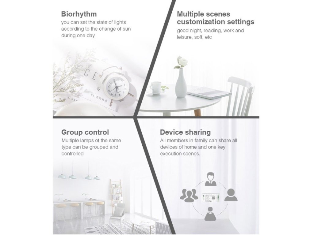Aplikácia MiBoxer Smart: podporuje nastavenie osvetlenia podľa biorytmu (tak ako sa cez deň mení úroveň slnečného svitu), podporuje multiscény (nočný režim, pracovný režim, režim na čítanie a podobne), podporuje vytváranie skupín osvetlenia, podporuje zdieľanie ovládania osvetlenia s ďalšími užívateľmi, podporuje nadefinovanie časov (Sleep a Wake up mode), kedy sa má osvetlenie automaticky zapnúť a vypnúť
