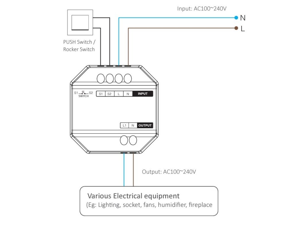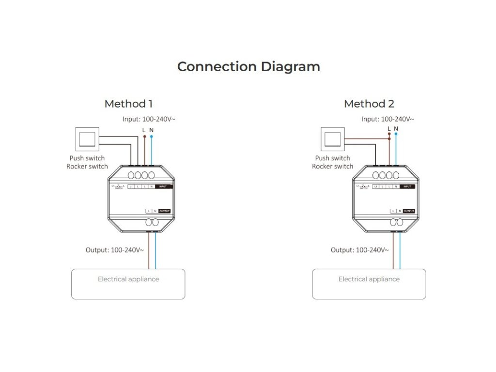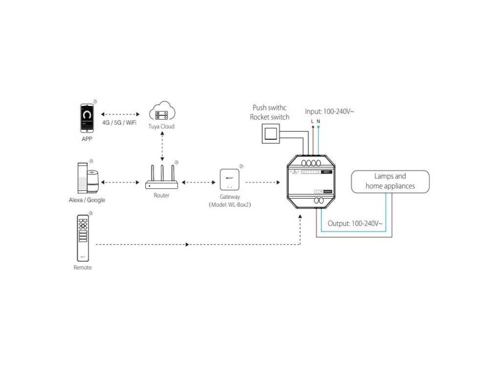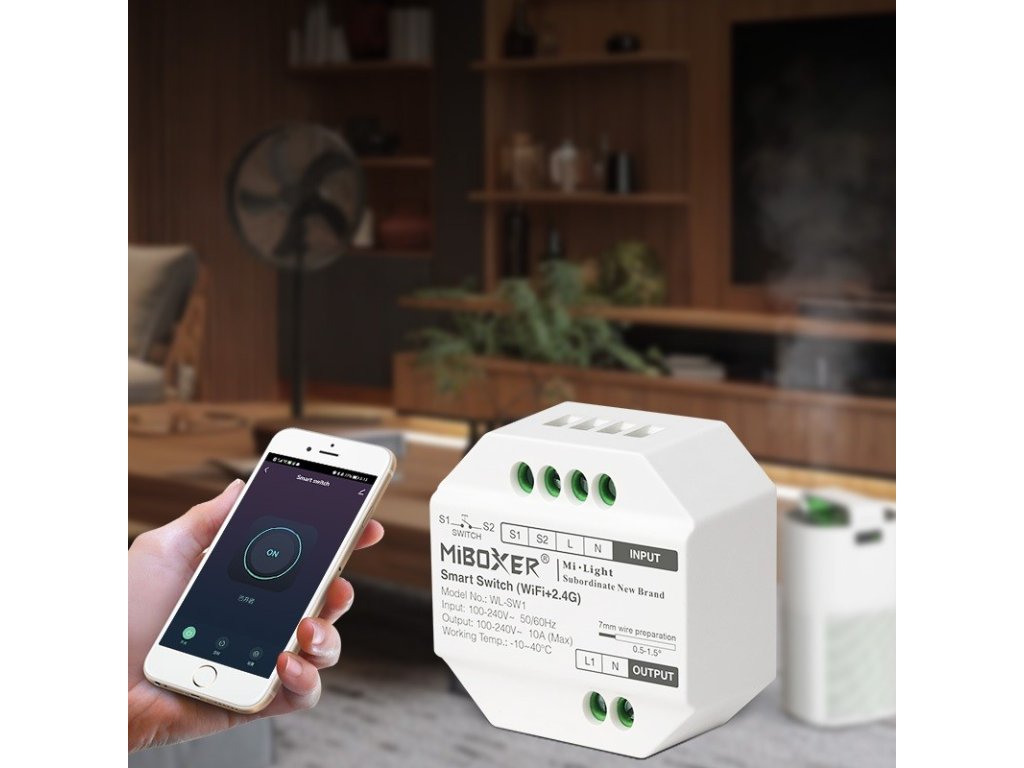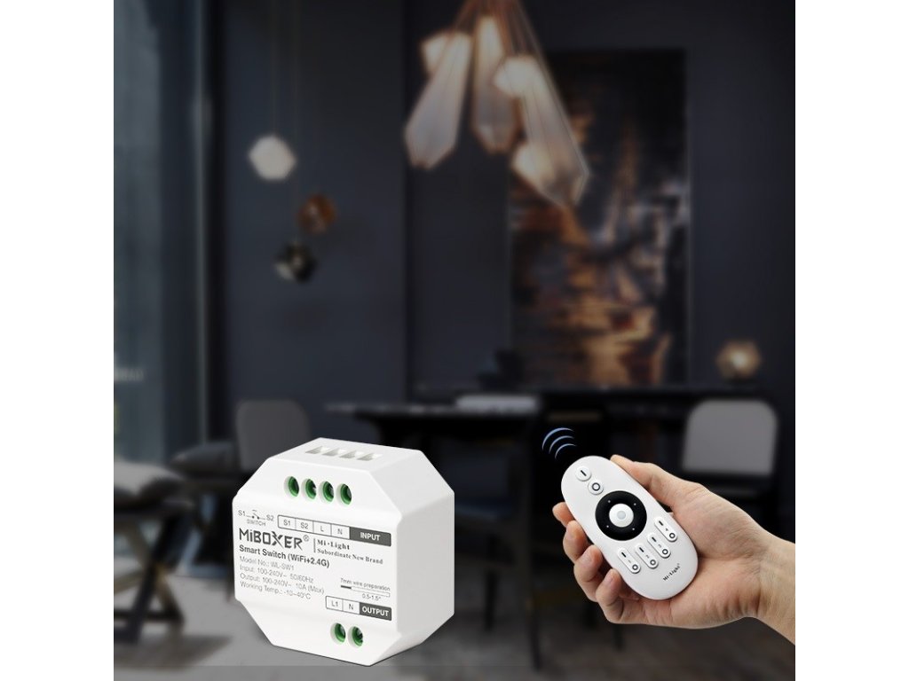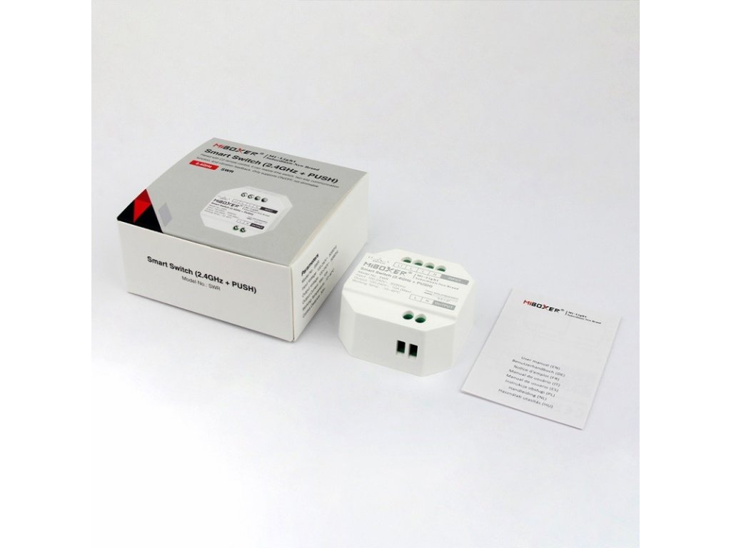 SMART vypínač MiLight (MiBoxer) SWR je zariadenie slúžiace na ovládanie akéhokoľvek elektrického zariadenia s napájaním AC100-240V. S jeho pomocou dokážete ovládať (zapínať/vypínať) akéhokoľvek zariadenia ktoré ku nemu pripojíte. Ovládať ich dokážete za pomoci diaľkových ovládaní (napríklad MiLight FUT007 alebo MiLight C2) alebo pripojíte ku nemu po kábli PUSH tlačítko alebo štandardný vypínač. Je navrhnutý tak, aby sa zmestil do bežnej elektroinštalačnej krabičky a mohli ste ho tak schovať pod zásuvku alebo vypínač na stene. SMART vypínač funguje zároveň aj ako opakovač, pričom zachováva 30 m rozostup medzi po sebe nasledujúcimi zariadeniami MiLight, umožňuje tak neobmedzený dosah. Po doplnení zostavy ovládania o prevodník WiFi/RF signálu MiLight WL-Box je možné SMART spínač MiLight SWR ovládať aj pomocou smartfónov alebo tabletov cez aplikáciu TUYA alebo MiBoxer Smart app a zároveň pomocou hlasových asistentov ako napríklad Alexa, Google Assistant, Yandex Alice. S použitím ovládania cez aplikácie získate zároveň možnosť automatizácie ovládania elektrických spotrebičov nakoľko budete môcť nastaviť rôzne časové okná zapnutia a vypnutia ovládaných elektrických zariadení. Spínač MiLight SWR sa používa na zapnutie/vypnutie LED svetiel (bez funkcie stmievania), klasických žiaroviek, halogénových lámp, ohrievačov, elektrických krbov a iných tradičných spotrebičov.