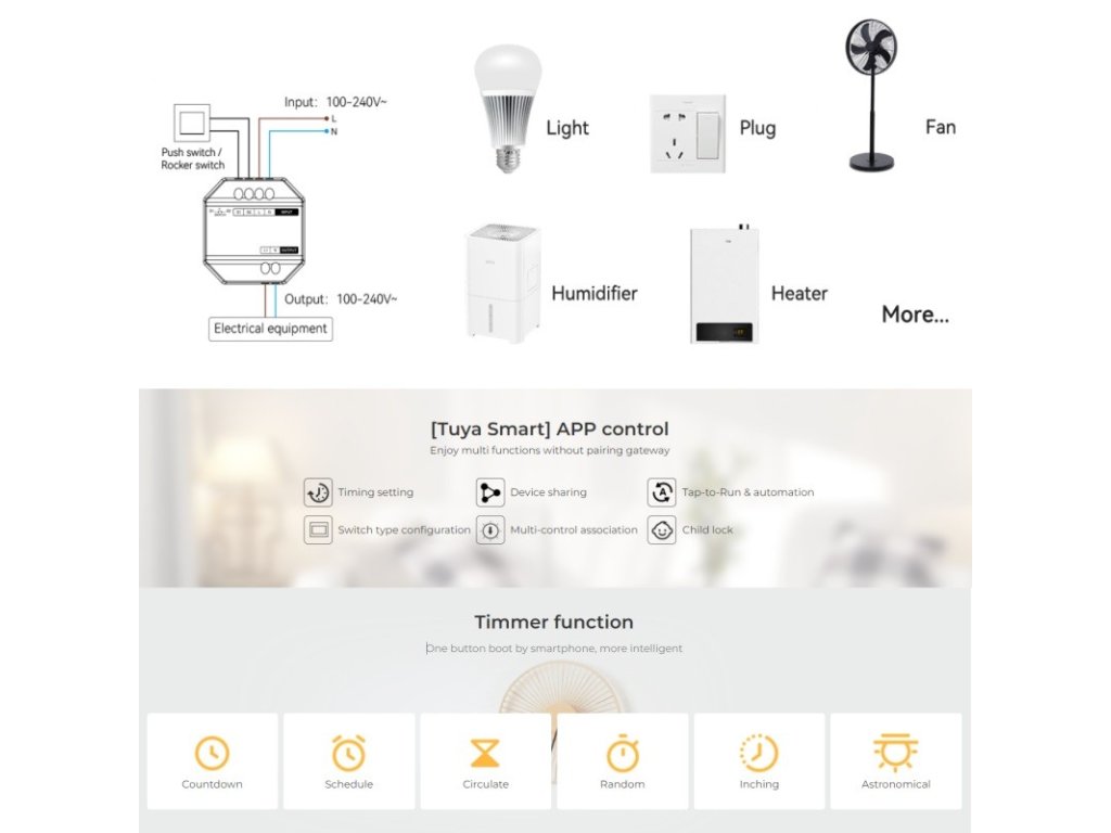 - Ovládanie cez RF 2,4GHz alebo po kábli pomocou bezpotencionálneho tlačítka PUSH alebo klasického nástenného vypínača