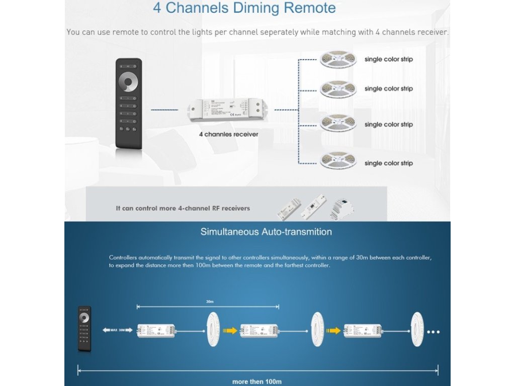 - Použiť sa dá ľubovoľné množstvo RF prijímačov pre každú svetelnú zónu - k DO je možné na jednu zónu spárovať aj viacej RF prijímačov stmievania/spínania (aj ich kombináciu, nemusí to byť identický RF prijímač, môže to byť ktorýkoľvek RF prijímač z tejto série - kompatibilný RF prijímač)
