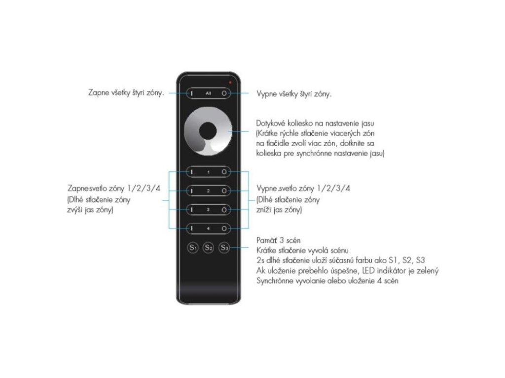 - Diaľkové ovládanie umožňuje ovládať 4 svetelné zóny nezávisle na sebe